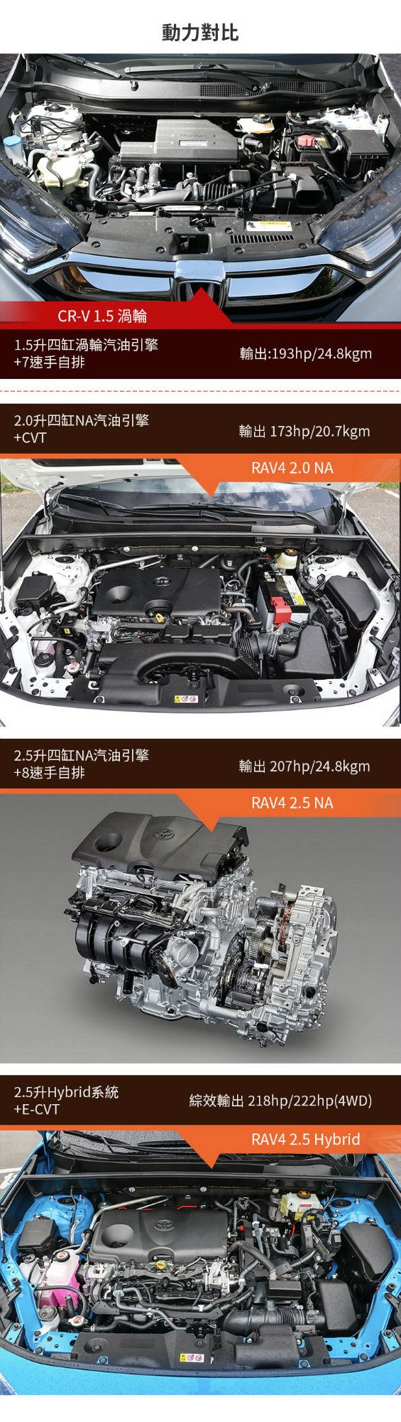 CR-V「很簡單」,符合現下小排量渦輪引擎之趨勢,採單一動力、VTi-S、S兩車型選擇;相較之下RAV4雖無渦輪加持,但擁有2.0和2.5NA、2.5Hybrid等多元動力,油電帶來的經濟效益也不能否認會成為其優勢之一。