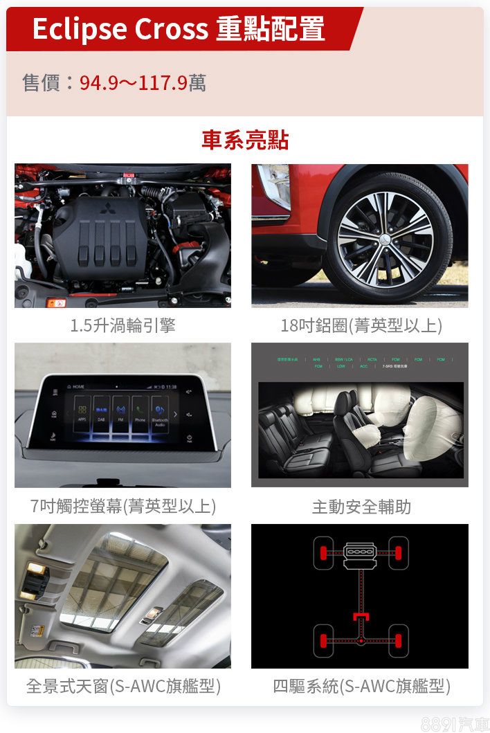 Eclipse Cross主被動安全配備算是齊備,全車系都有7氣囊的配置,含行人偵測的主動煞車府輔助、車道偏移以及自動遠光燈也都是標準配備,大家在意的ACC主動跟車系統則是要到菁英型以上才有配置,除了最低規的車型之外,剩餘車型也都有7吋的中控螢幕,整體而言在安全以及方便型來說都相當完備。