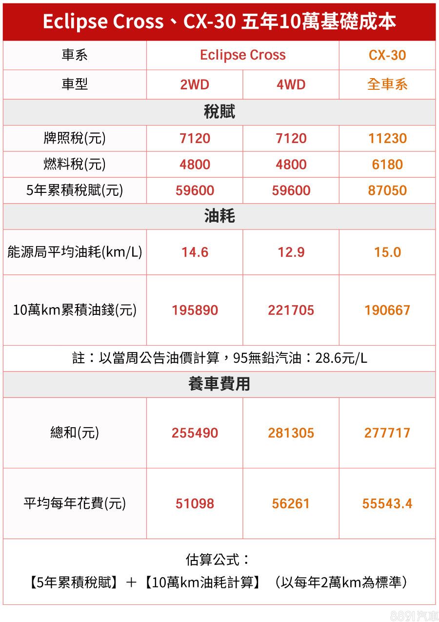 兩輛車皆是進口車型,自然在保養成本上並沒有太大的區隔,CX-30雖然在稅金上較為吃虧,但是良好的油耗也彌補了一些養車成本,而Eclipse Cross若是選擇四驅車型的話就會較貴,但你如果真的想要有四驅系統的話,也只能選擇Eclipse Cross,不過金額的差別並沒有很大,這部份兩車系算是平手。