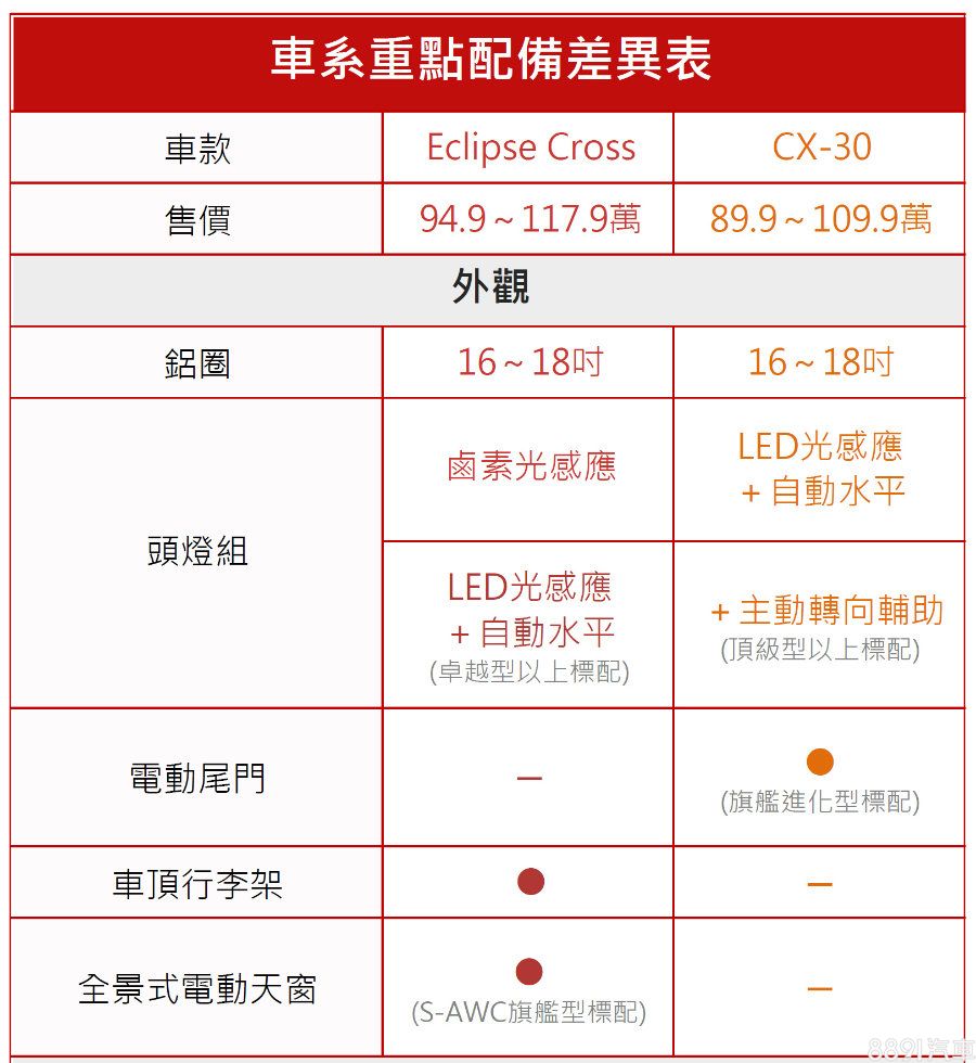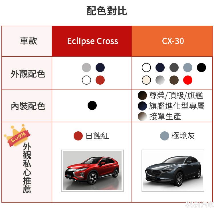 兩車型皆有四種規格可供選擇,Eclipse Cross在價格上來說皆貴上了4~8萬元不等,最高階的車型還有四驅可以選擇,輔以新世代的座艙設計以及跑格的外觀,吸引了不少年輕族群喜愛。而CX-30做為Mazda品牌當中的新款車型,以Mazda3做為基礎加以改造,打進了CX-3與CX-5中間的市場級距,跨界車型更吸引人之外,價格也相當具有優勢。