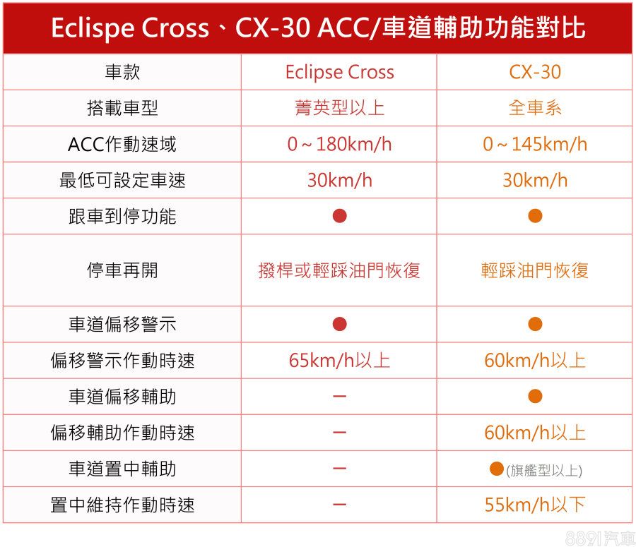 全車系都搭載ACC系統讓CX-30有著較大的優勢,且擁有更好的車道輔助功能,這一點是Eclipse Cross的硬傷,雖然CX-30在旗艦型以上標配的車道維持系統僅有55km/h以下作動,但有總比沒有來的更好,且全車系在60km/h以上還是有著車道偏移輔助,相對Eclipse Cross僅有警示功能,CX-30這方面算是完勝。