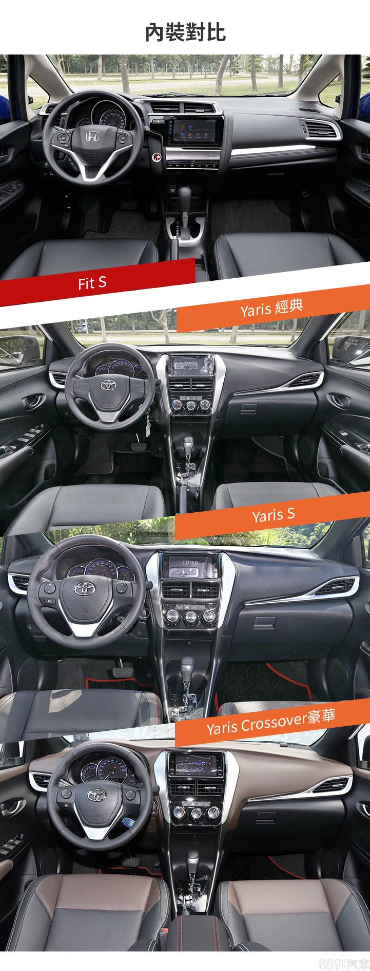 Fit座艙設計帶點駕駛導向風格,層次性的介面安排顯得沉穩亦不失時尚,相對的Yaris則採用對稱式的設計風格,而因車型所搭配之風格差異,也會在內裝縫線、用色搭配等細節有不同呈現。而在先前的「超級測試」單元中,我們更發現Fit不論是後座乘坐或尾廂空間均更勝一籌,且可上掀的後排椅面也讓空間運用更添靈活性,不過Yaris由於後懸吊吸震性較佳,在乘坐舒適表現上反而較獲肯定。