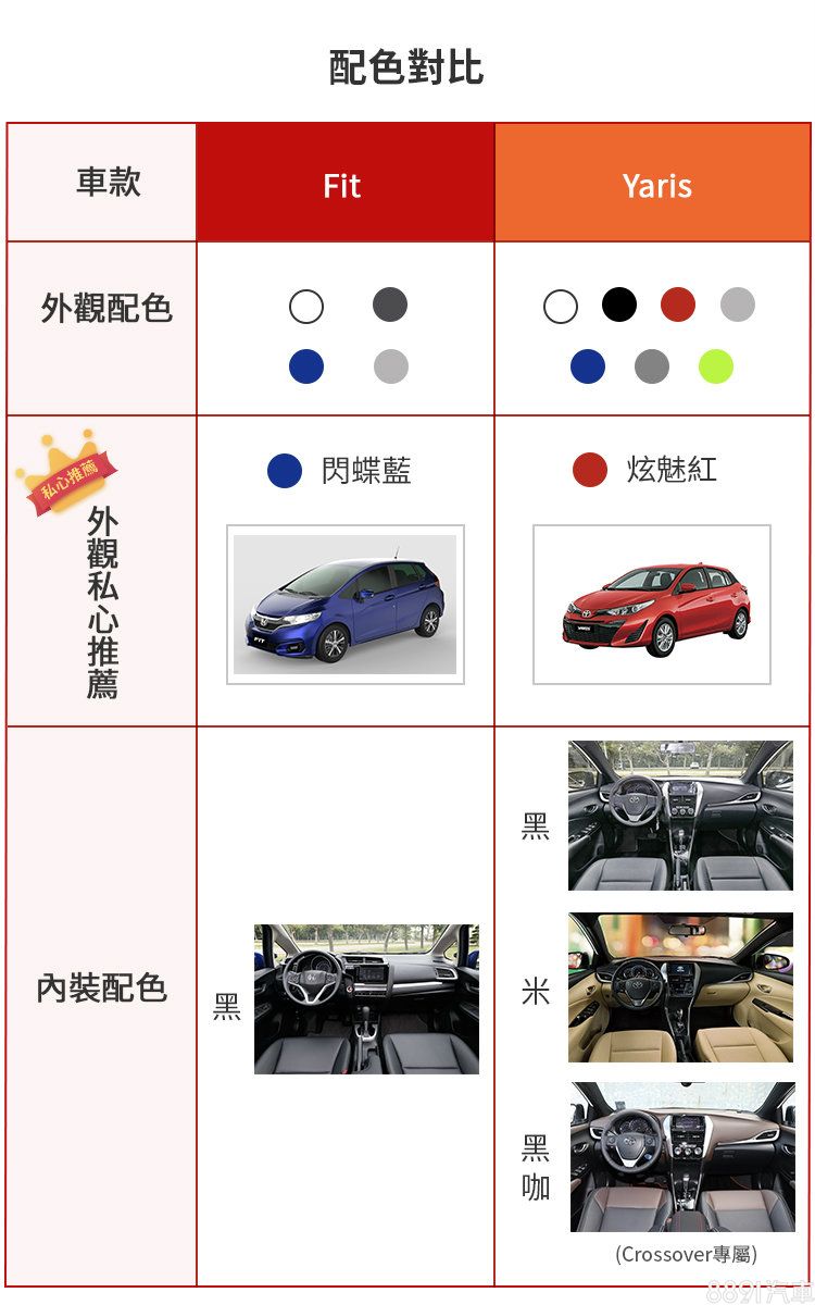為迎合較為年輕化的目標客群,Yaris提供多達7種外觀車色選擇,並有多種內裝配色可供搭配。Fit在這方面相對保守,提供的色款有限,且多為灰階色系,但其中的閃蝶藍車色會因角度不同,而折射出漸層式的光影風格,炫目亮麗,是個人私心推薦的色款選擇!