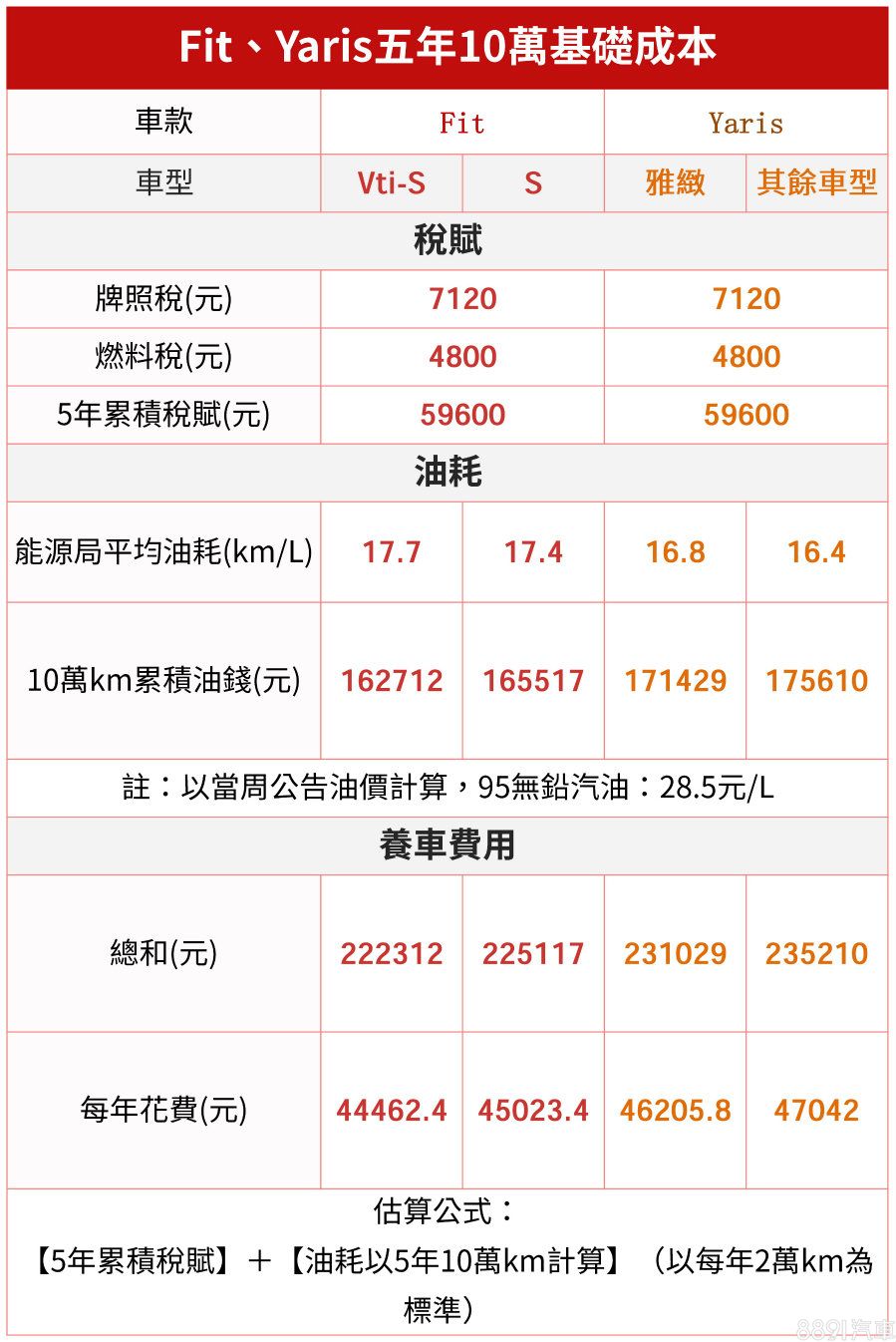 不論Fit或Yaris,兩車系同樣搭載1.5升動力,有著相同的年度稅金負擔,同時也因為平均油耗表現像近,累積10萬公里油資大致落在17萬元左右,使得兩車估算後的年度基礎成本並無顯著優劣。