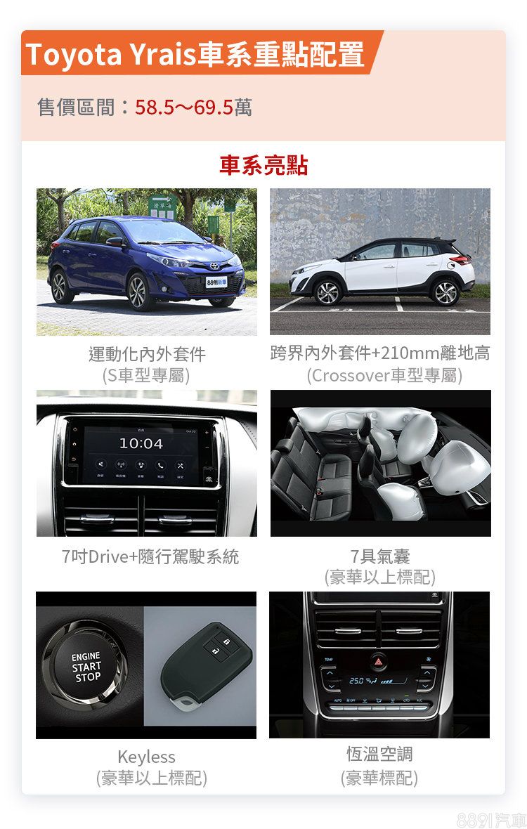 Yaris則藉由較長的引擎室比例,為車長視覺帶來延展效果,並依車型差異而有不同的外觀風格做搭配,除了雅致型與經典型的標準式樣,Yaris S另搭配黑色後視鏡蓋、保桿紅色飾條、尾翼等動感設計,至於切合時下跨界風潮的Yaris Cross則以高底輕越野的視覺風格搶市。