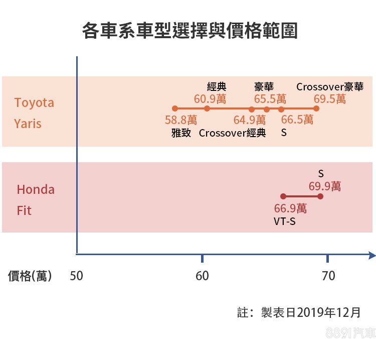 Fit和Yaris有著截然不同的銷售策略,Yaris打出車海攻勢,在55~70萬價格區間內推出多達6款車型,其中並包含運動化的S版及跨界風的Yaris Cross,編成多樣性在同級中無人能及。Fit則提供較單純的兩階編成,均瞄準65~70萬價格帶,不過由於兩車價差僅3萬,但配備差異顯著,因而在車系中相對有著較高C/P值的高規S車型,成為Fit中較熱賣的選擇。