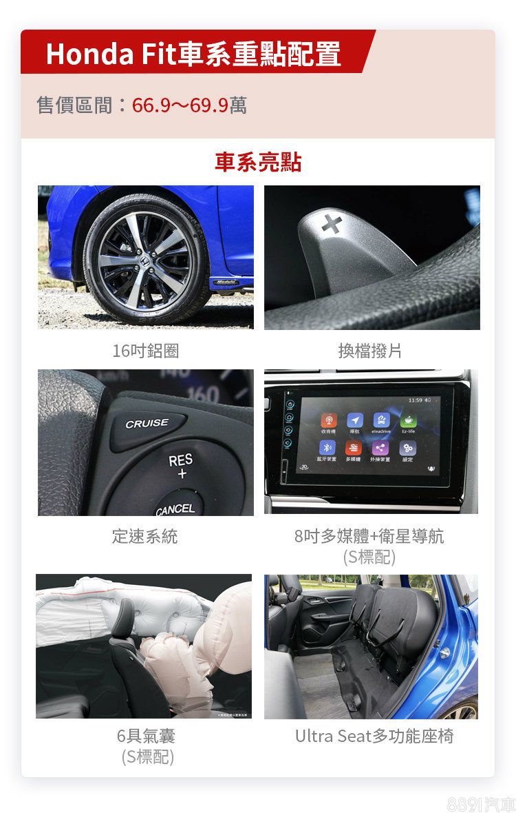 Fit入門款即近67萬,是同級中門檻最高的車系,但也因此基本款配備已相對豐富。諸如16吋鋁圈、換檔撥片、定速巡航、恆溫空調和可上掀收摺之6/4分離式後排等,均列為全車系標準配備。而頂規憑藉3萬價差可換得附導航之8吋觸控螢幕,並增加車側氣簾至6氣囊標配,多付出3萬升級頂規S車型顯然相當值得。