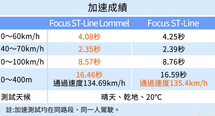 兩者在動力相同情況下,賽場上直線衝刺感受固然相當,影響賽道成績的關鍵,便是出彎加速時機,多連桿在後軸安定前提下,讓人敢用稍快速度轉進彎角,動態容易預測讓駕駛更能提早補油出彎,一點一滴累積優勢,最終也讓多連桿版本跑出更快的41.9秒成績。