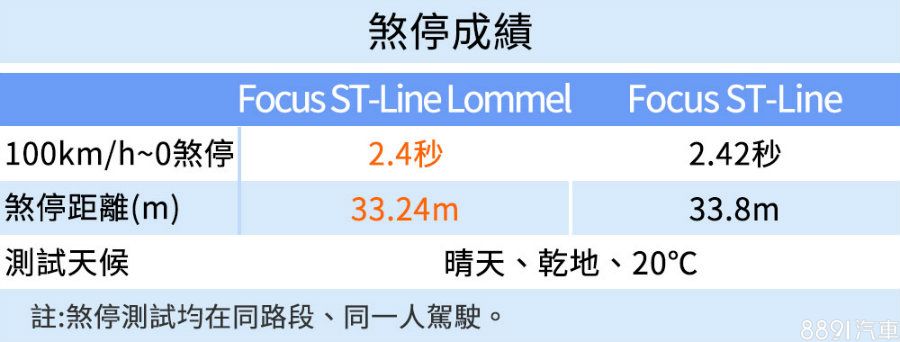 實際比對數據,兩車煞車距離都不到34m,原廠車這樣的數據甚至勝過部分性能車款,表現相當不賴。儘管多連桿車型煞車距離確實略短,不過差距微小,仍屬合理誤差範圍內,且多次測試中兩車互有勝負,因此煞停測試兩車表現相當。