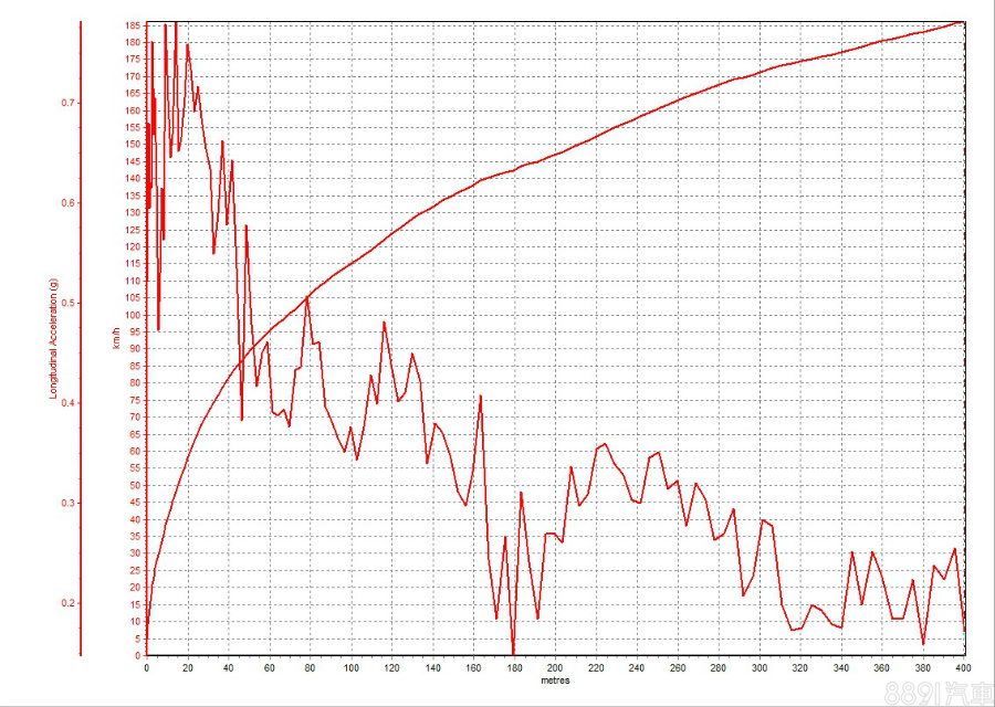 以賽道模式實測加速表現,起步轉速上限為2000rpm,覺得有點略低,因為起跑瞬間的體感推力少了點猛烈,看P Box曲線也是如此,起跑瞬間G值衝上0.7G之後隨即下掉,才再衝上最高的0.78G,測了三趟,0~100km/h都在4.7秒左右徘徊,最佳為4.68秒,0~400km/h則是12.68秒@186.08km/h,而100~200km/h再加速則是9.99秒,坦白說,以550hp馬力來說,整體表現應該可以再快一些。