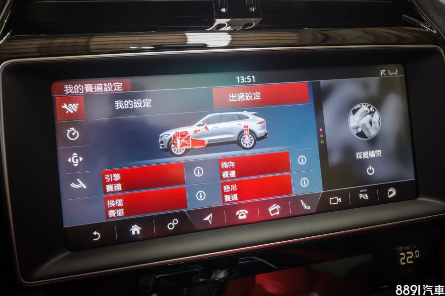F-Pace SVR的電子懸吊兩段阻尼設定,雖然選擇有點少,但設定分明,一般模式頗為舒適,甚至有點略軟,除非市區緩行,不然我實在不愛,所以基本上在整天的試駕裡,我都是將行車模式切為賽道,讓懸吊阻尼處於硬朗的程度,雖然硬,但不會顛頗,並保有理想的行路質感,還挺不錯的!