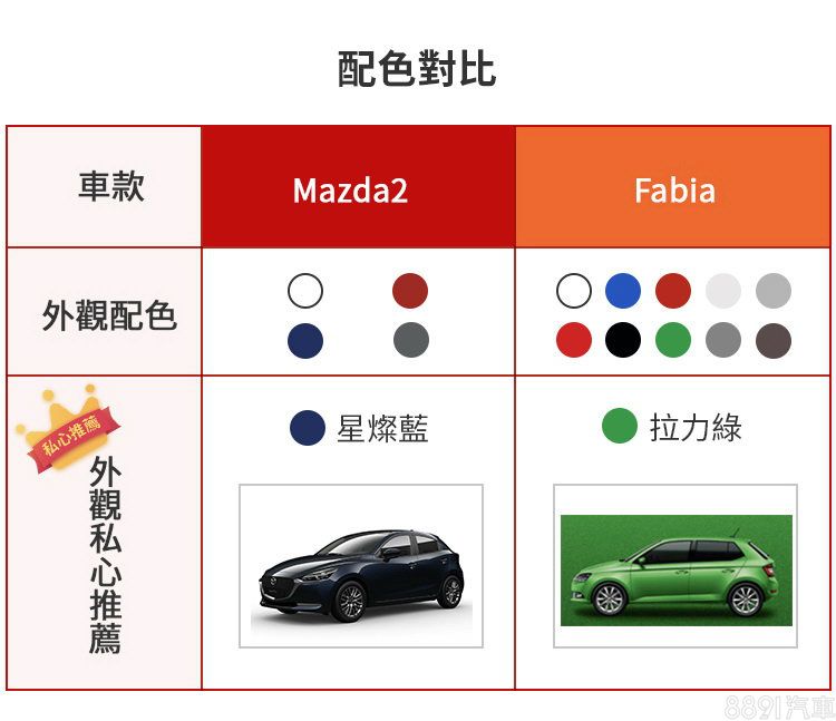 相形之下,Fabia提供多達10種車色,加上可選的雙色塗裝(需加價2.7萬),更符合年輕人胃口,特別要提一下,Fabia的炫彩紅需加價2.5萬方可獲得;而Mazda2不外乎品牌常見的車色選擇,驚喜感不大,鋼鐵灰和驚艷魂動紅需分別加價1萬、1.5萬元,這邊推薦的都是比較少見、認為較活潑的車色。