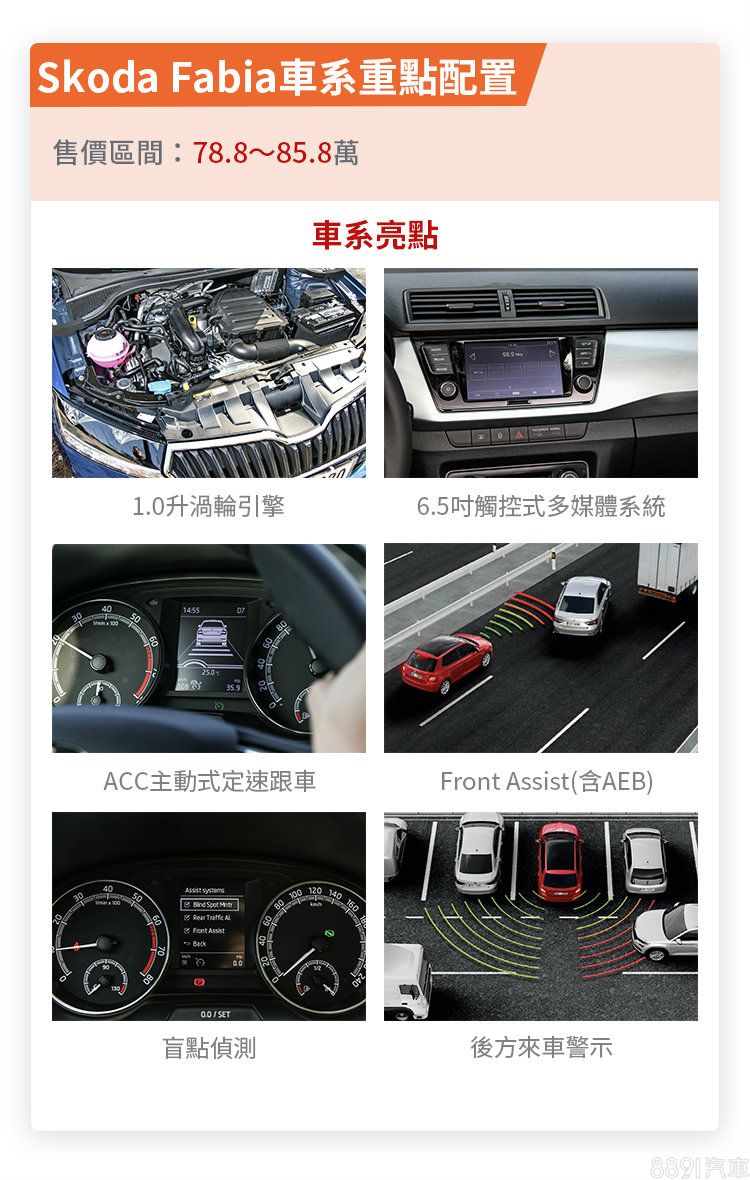 Fabia的配備策略完全跟上市場關注度,除了基本的沒少,重點是全車系標配ACC、Front Assist前方輔助(含AEB)、盲點偵測、RCTA後方倒車警示等列為標準配備,還有自家集團招牌的MKB二次碰撞預煞、6氣囊也沒少,不誇張,主動安全部分目前同級僅同集團的Polo可與其「比美」,不過說實話多媒體系統略顯陽春,座椅也非國人習慣的皮質包覆,是較可惜之處。此外,這邊提一下,ACC作動速域範圍為0~160km/h(30km/h才可啟動),可跟車到停,3秒內主動跟上,不然就得踩一下油門,或是撥動定速桿,才能再次喚醒ACC。