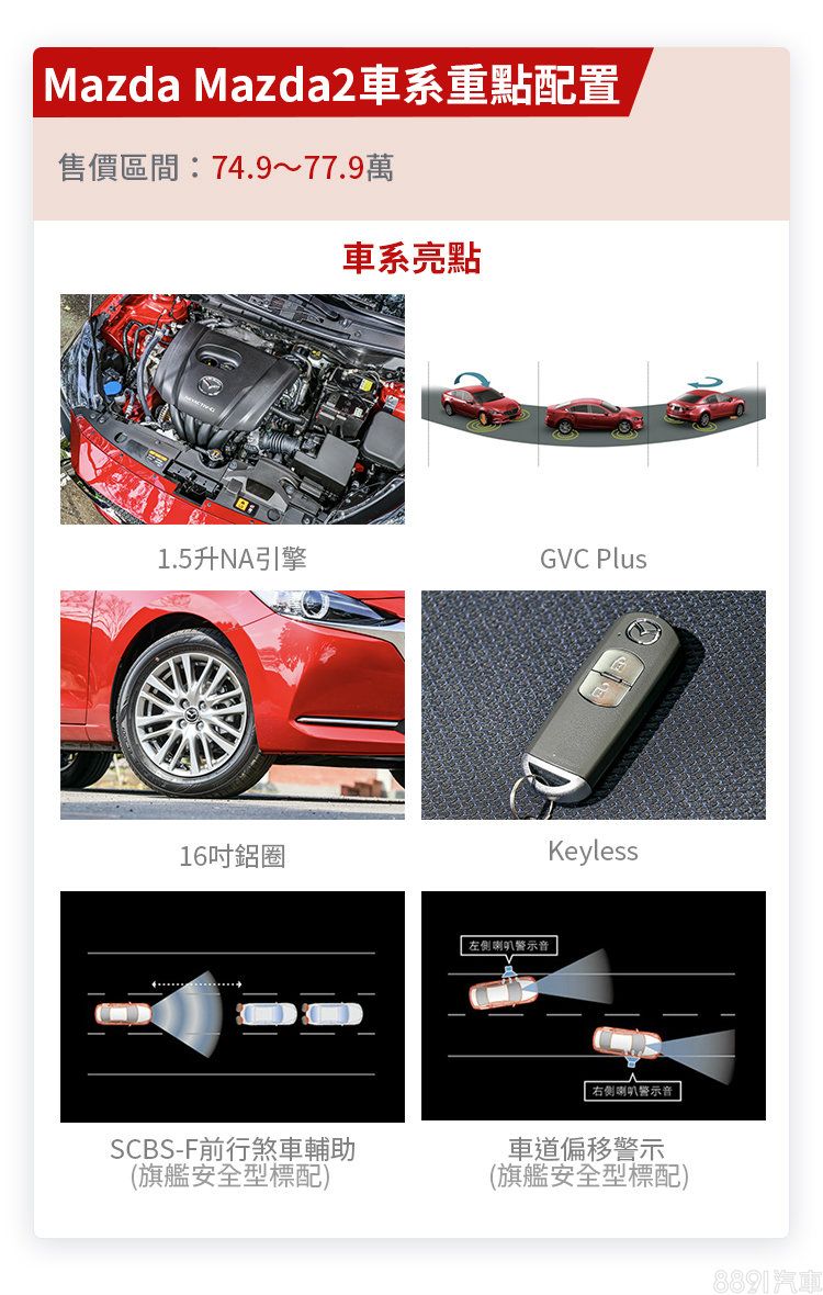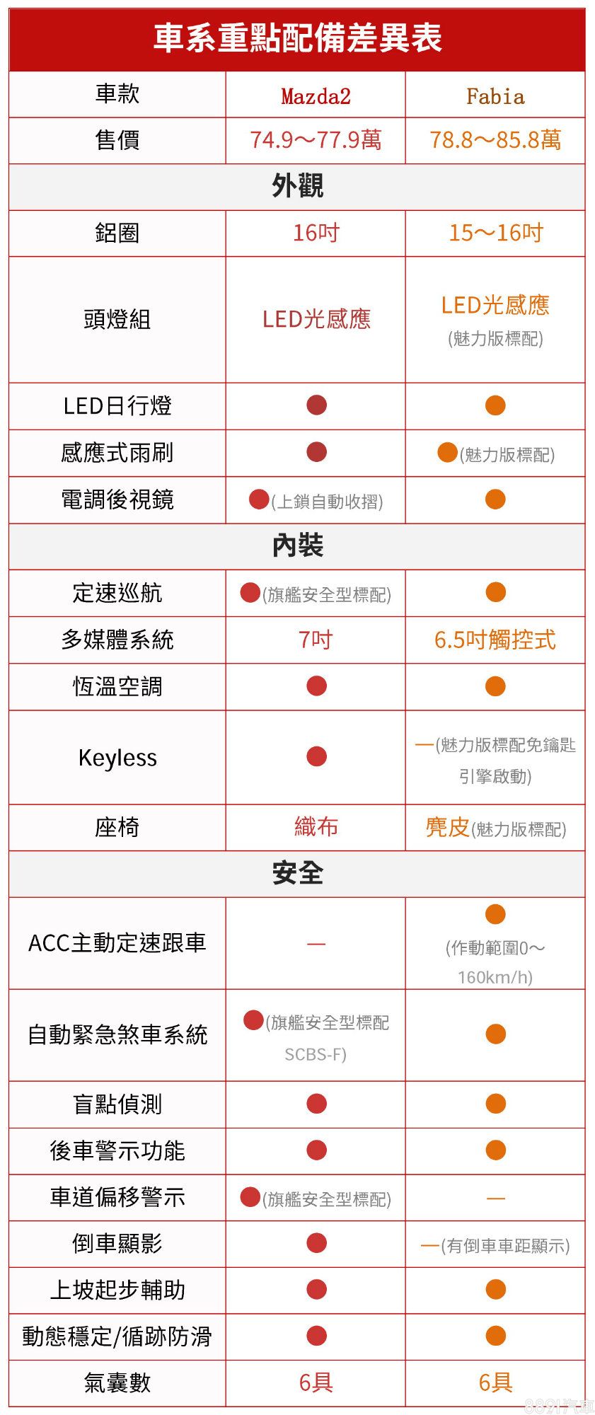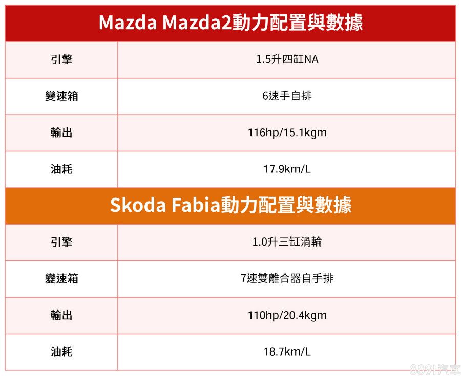 Mazda2和Fabia同樣採單一動力2車型選擇,且價格帶十分相近,兩車入手價格都壓在80萬內,且小改款工程重點之一都放在主動安全強化,算是晉身「進口一族」的試金石,質感和安全亦能兼顧。