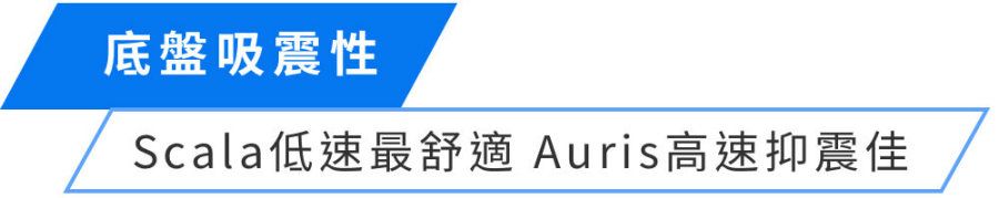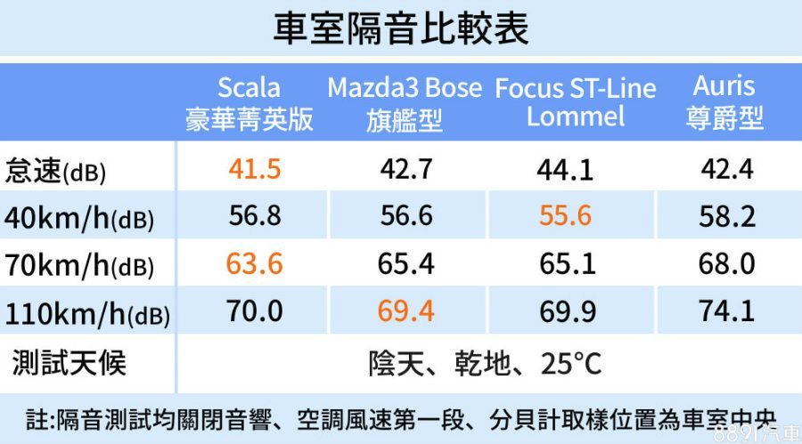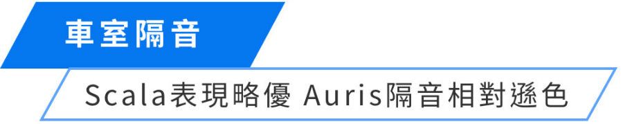 Scala在低速擁有最寧靜的行駛質感,主要歸功於引擎室隔音好之外,底盤噪音也相當輕微,唯一的缺點是高速巡航風切聲略大,綜合數值與體感,Scala為本次隔音最優異者。隔音表現最差者為Auris,主要110km/h巡航時風切聲、底盤噪音明顯,讓數值來到74.1dB。