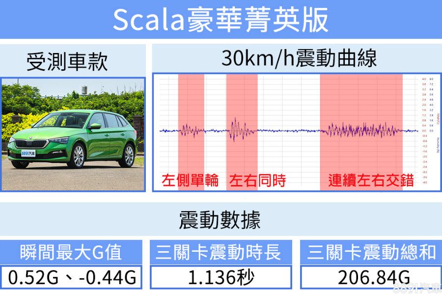 測試車速提高,懸吊所面對的衝擊也就相對提升,Scala壓過陣仗的瞬間最大G值稍有提升,但仍是一派舒適表現。有趣的是60km/h測試時震動時長來到1.254秒,比起30km/h要略長些許,按照過往測試經驗這代表Scala較不善於面對中高速域,阻尼稍有來不及吸收的情況,但同時也代表Scala低速舒適性真的很棒!