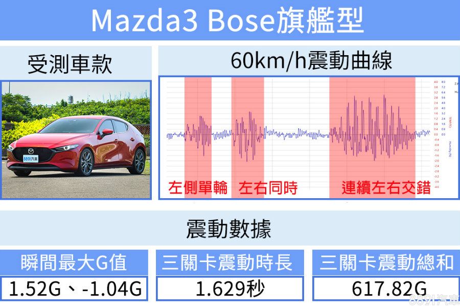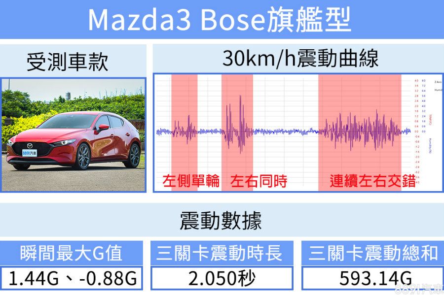 不論30或60km/h車速,Mazda3的底盤調性都十分接近,面對更大的衝擊力,Mazda3 G值增加在合理範圍,並沒有因為車速提升而更不舒服,只不過阻尼仍是無法確實吸收衝擊力,不僅震動曲線紊亂,震動時長與震動總和兩項指標也依然是四車末位,雖然在平坦路面開起來舒適有質感,一旦路面不平整便束手無策了。