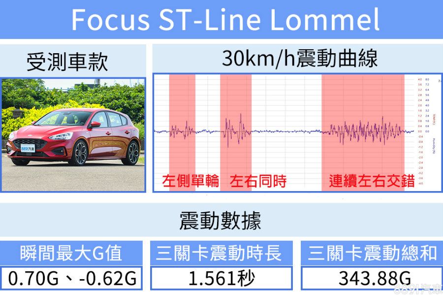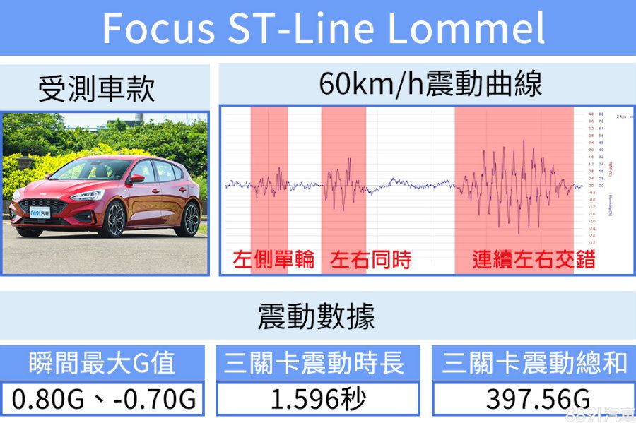 儘管車速提高、衝擊力增加,Focus的瞬間最大G值卻未顯著提升,震動力總和相較30km/h也僅小幅增加,代表Focus阻尼設計確實有兩把刷子,面對不同車速都能保有相近回饋與舒適性,雖然在數據上不若其餘對手,但駕駛人卻因此而容易掌握車身動態,不論高低速都能保有充分信心。
