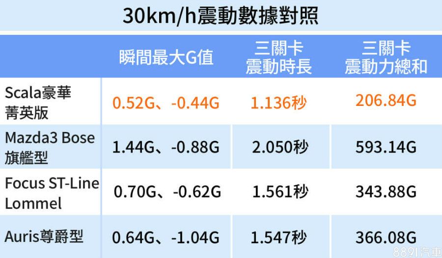 比對四車在30km/h測試數據,Scala明顯三項數據都優於同場對手,低速舒適表現最佳。Mazda3主要弱點在阻尼無法有效吸收震盪,令震動時長顯著較長,最終導致震動力總和偏高,路面不平整時比起對手會有較多晃動感受。至於Focus與Auris舒適表現相近,以數據來看舒適性都在合理範圍。