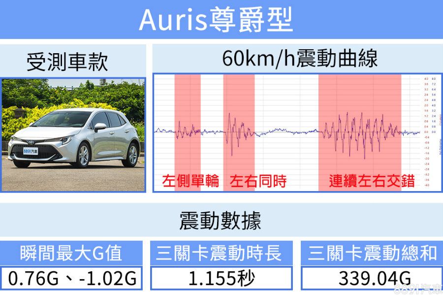 Auris尊爵型配胎尺寸205/55R16,在四車中扁平比最高,撫平路面起伏的能力理論上也比Focus、Mazda3兩輛18吋配胎的車款要好。然而觀察震動曲線,能發覺走向較偏負G值一些,代表懸吊較不善於應對路面突起,體感上要比Focus略晃一些,不過震動時長與G值總和都還算合理表現,舒適度尚可。