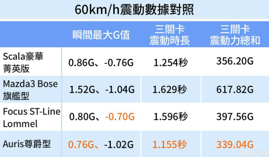 將各車60km/h測試數據做個對照,低速表現優異的Scala在高速表現平平,但與對手相較舒適性仍有一定水準;Auris則有如脫胎換骨一般,在60km/h車速下表現出色,G值控制得宜、車身回穩迅速,僅339.04G的G值總和在此級距車款中算是相當亮眼。