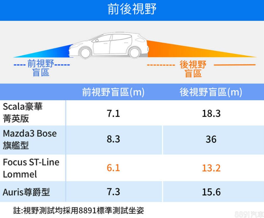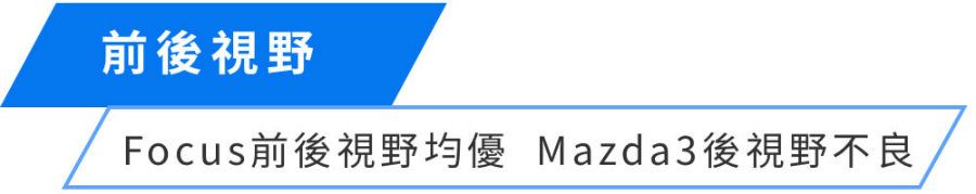 Mazda3採用高腰線設計來彰顯運動性格,尾窗面積也明顯比對手小片,使後視野距離達到36m,好在倒車顯影系統變形少、畫質佳,能確實起到輔助效果;至於視野最佳的則是Foucs,車身腰線低之外,窗戶面積也夠大片,且乘坐重心偏高,對視野也有幫助。