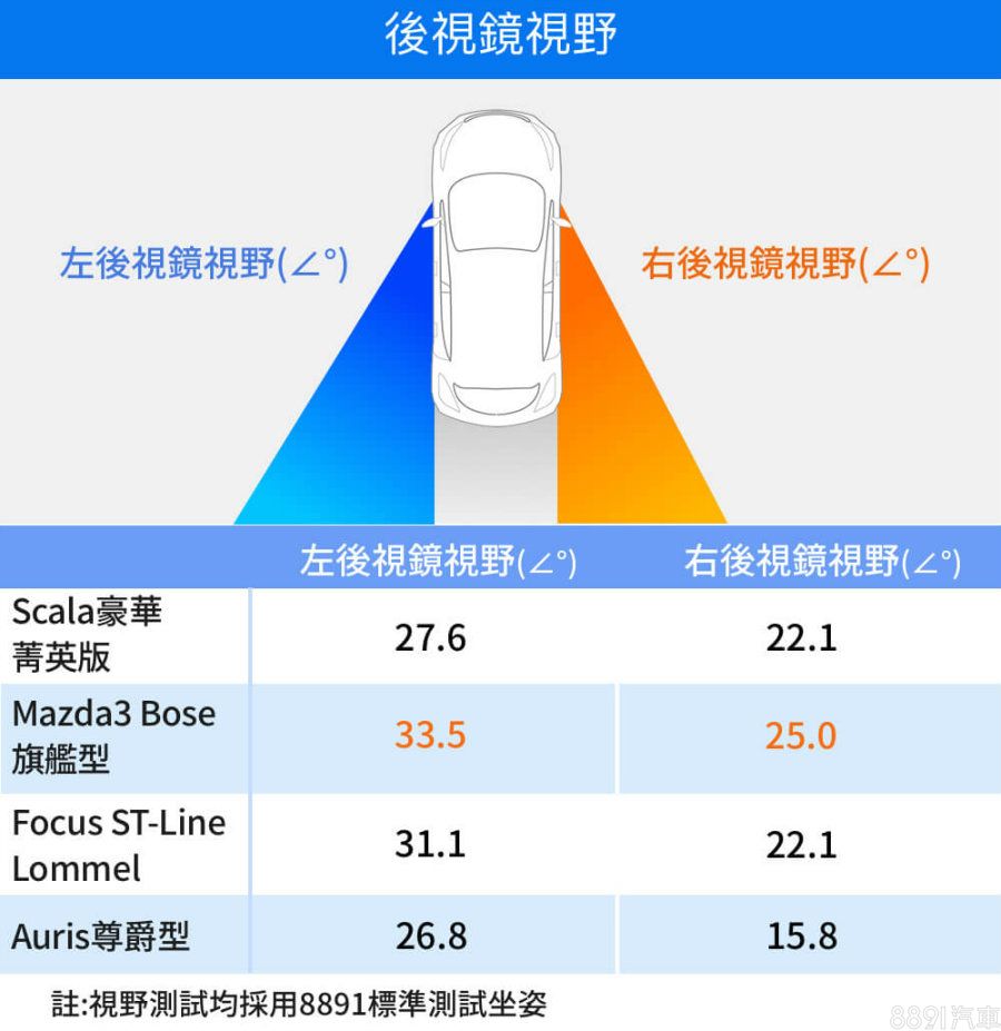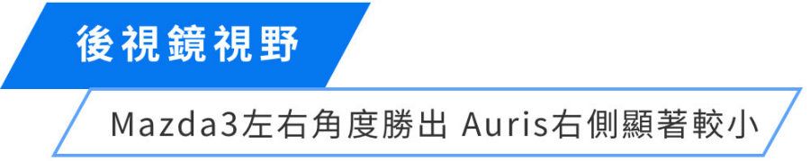 Mazda3左右後視鏡均無廣角設計,但鏡面夠大且向外延伸,讓兩側視野勝過對手。至於Auris視野明顯較差,右後視鏡甚至只有15.8°,加上入門尊爵型少了盲點偵測系統,實際上路、切換車道需多留意一點。