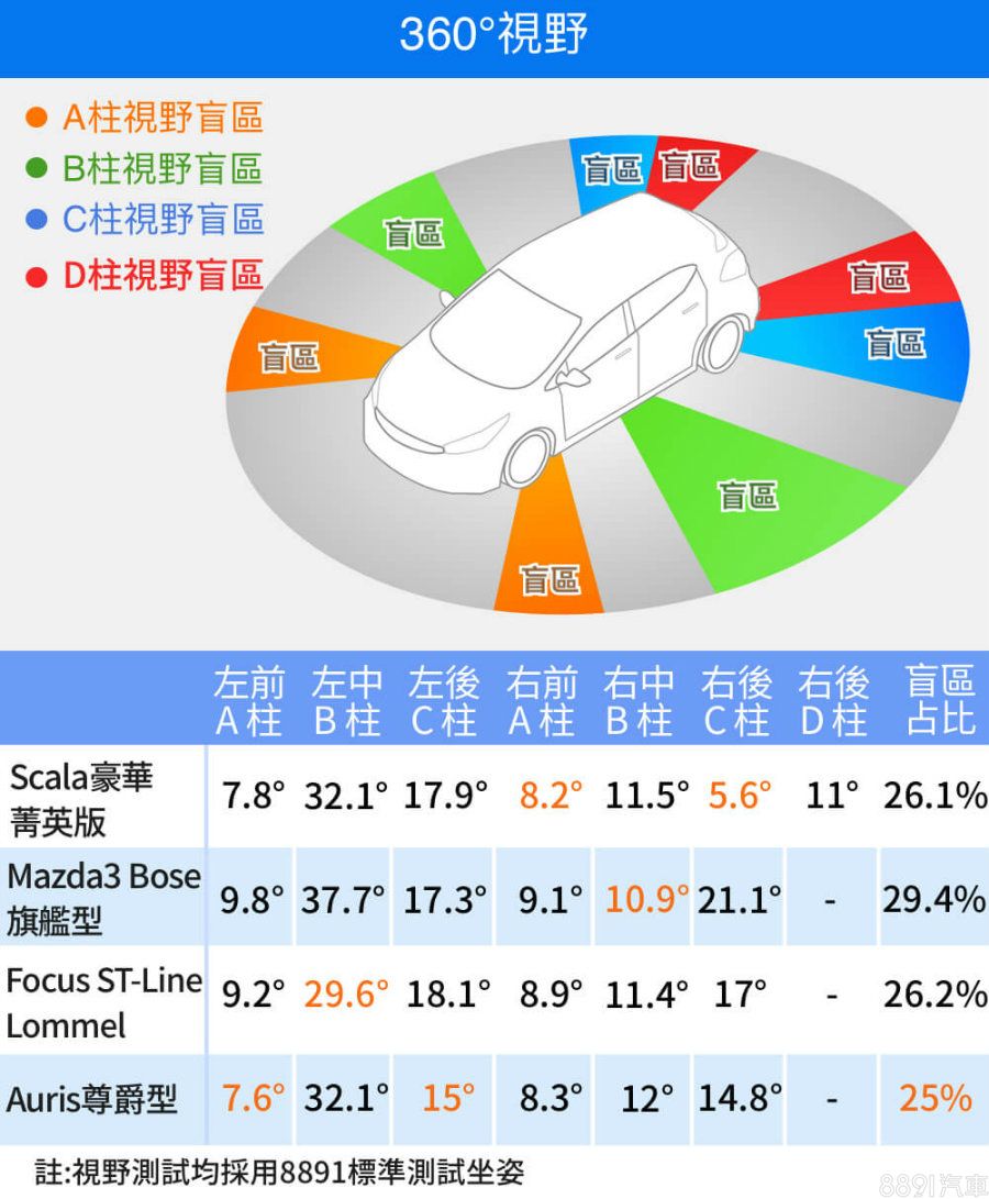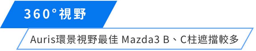 Auris雖然強調運動化表現,但A、B、C柱並不粗壯,優點是可以換得更好的環景視野,總遮蔽率25%為同場最低。至於Mazda3則是B、C柱明顯遮蔽多,嚴重影響視野,還好有環景輔助可以搭配使用,掀背車體格也不算大,實際上路不至於提心吊膽。