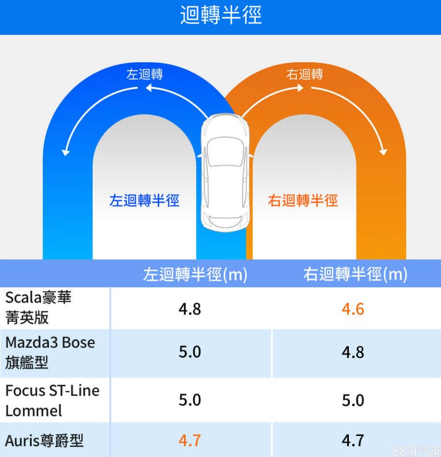 依照軸距長短來排,軸距最短者為Auris的2640mm,其次為Scala的2649mm,符合此次迴轉半徑排名;其餘兩者迴轉半徑雖然略大,但也符合中型車水準,實際上路並無明顯差異或不便。