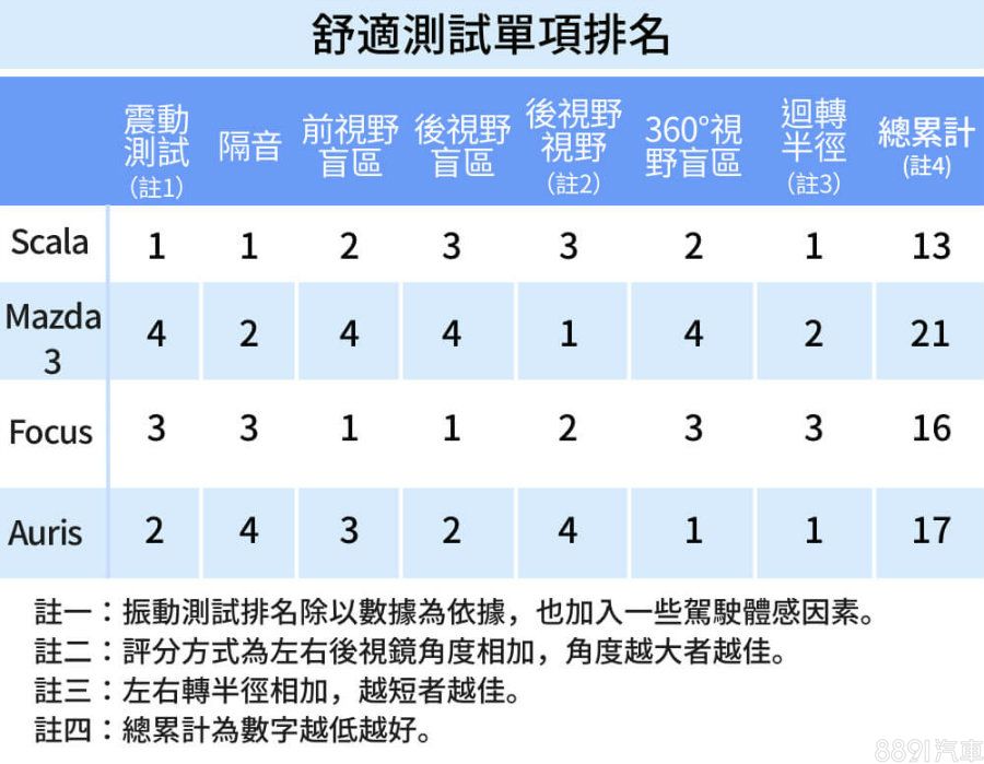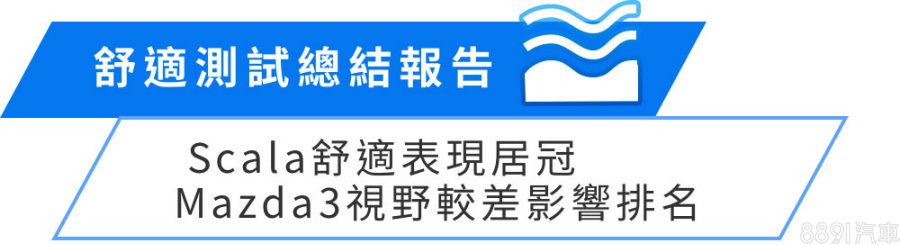 總結舒適測試,在震動測試、隔音表現項目Scala都交出優異成績,代表行路質感相對出色,迴轉半徑小,也符合掀背車靈活好駕的特質,僅中庸的視野是唯一美中不足之處,綜合表現來看,Scala奪下舒適冠軍實至名歸!亞軍Focus則是視野表現佳,前後、左右視野開闊,加上豐富主動安全系統,能大幅降低駕駛「心理壓力」也算舒適的一環。