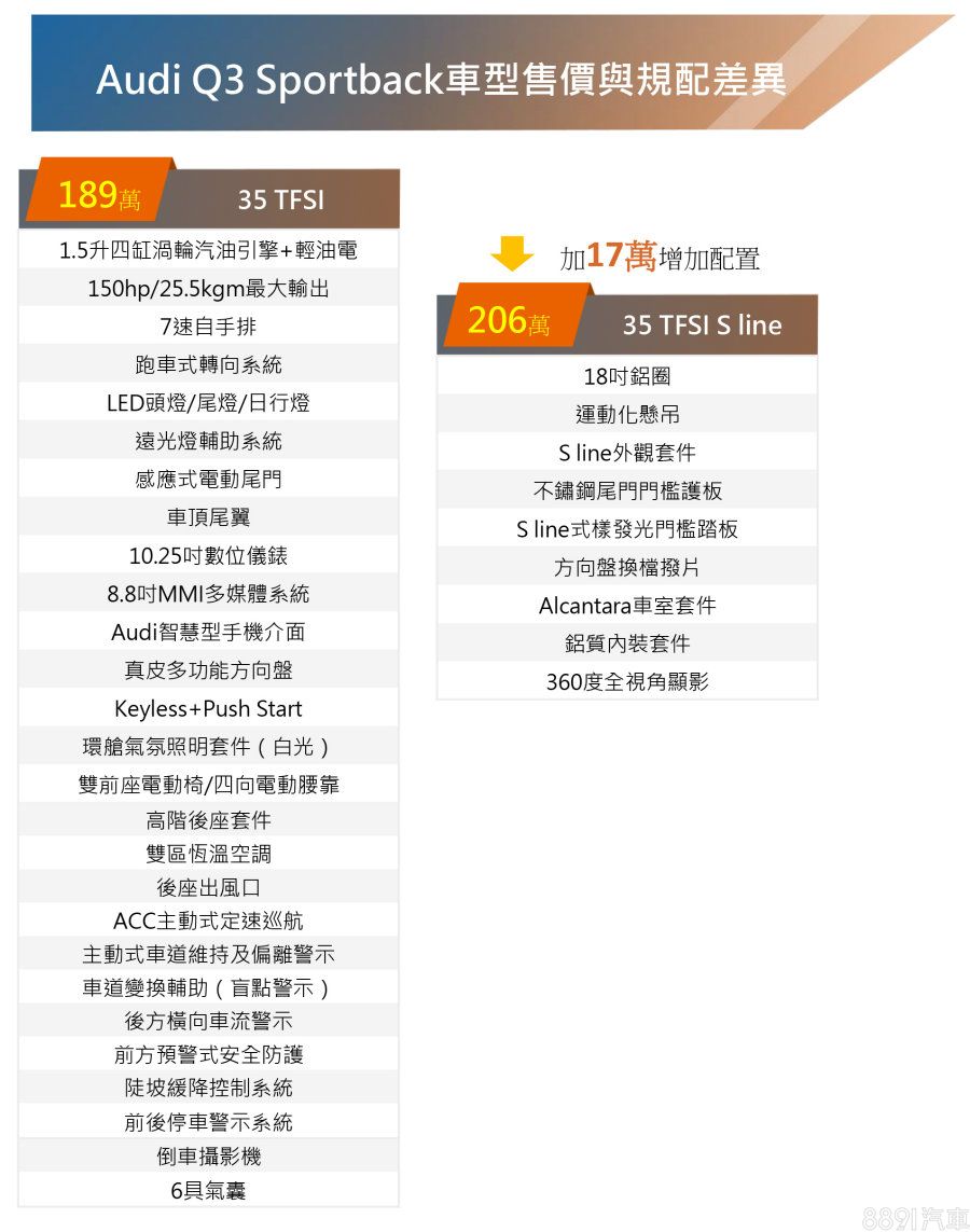 此次試駕車型是要價189萬的35 TFSI版本,透過圖表不難發現配備水準已相當豐富,不論舒適、豪華配備都屬完善,也將全速域ACC、車道維持、盲點等智慧駕駛輔助列為標配。往上一級則是206萬的S Line版本,主要增加運動化懸吊、18吋鋁圈、專屬外觀等配備,車內則增加換檔撥片、運動化內裝與還景影像,升級感還算鮮明,但若不是追求熱血操駕感的車主似乎就沒有提高預算的必要性。