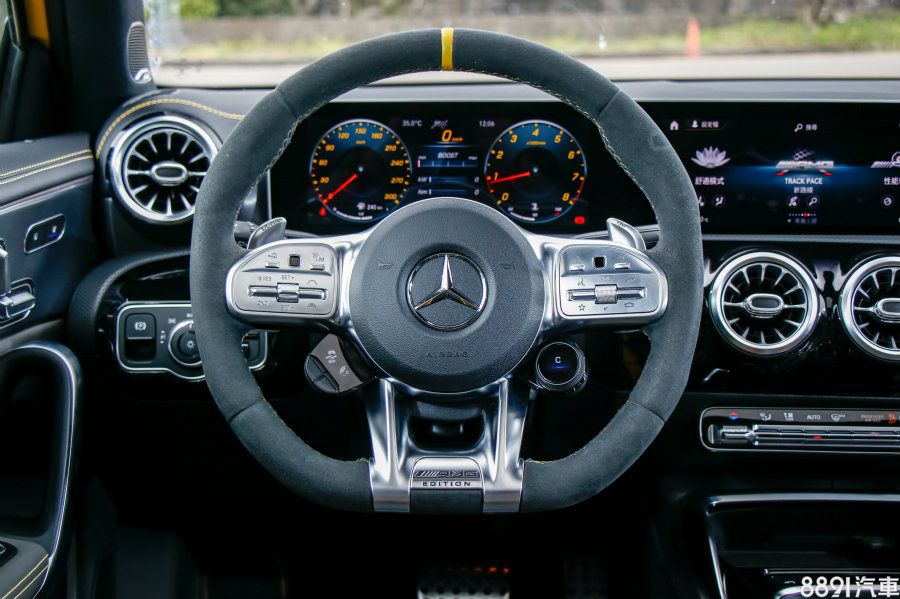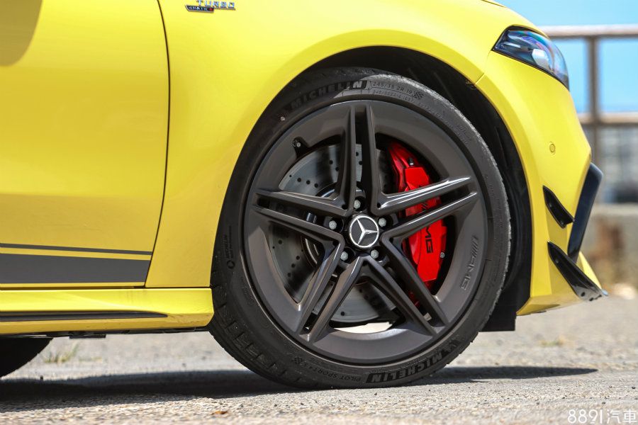 此款19吋五輻雙肋式鋁圈為Edition 1專用,不過尺碼與標準配置相同,並搭配245/35R19米其林PS4S高性能跑胎,不僅胎寬稍大於A 35,煞車規格也從前4活塞卡鉗+350mm碟盤,升級為前6活塞卡鉗+360mm碟盤,後煞車則維持單活塞卡鉗+330mm碟盤,對應421hp和四驅配置頗有餘裕,尤其拉拔到測試環境激烈的麗寶賽道更是明顯。