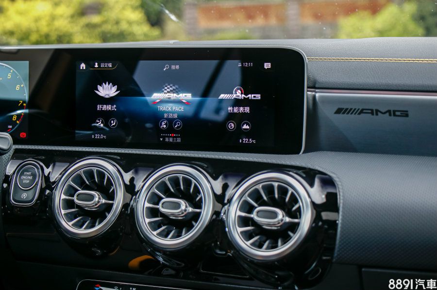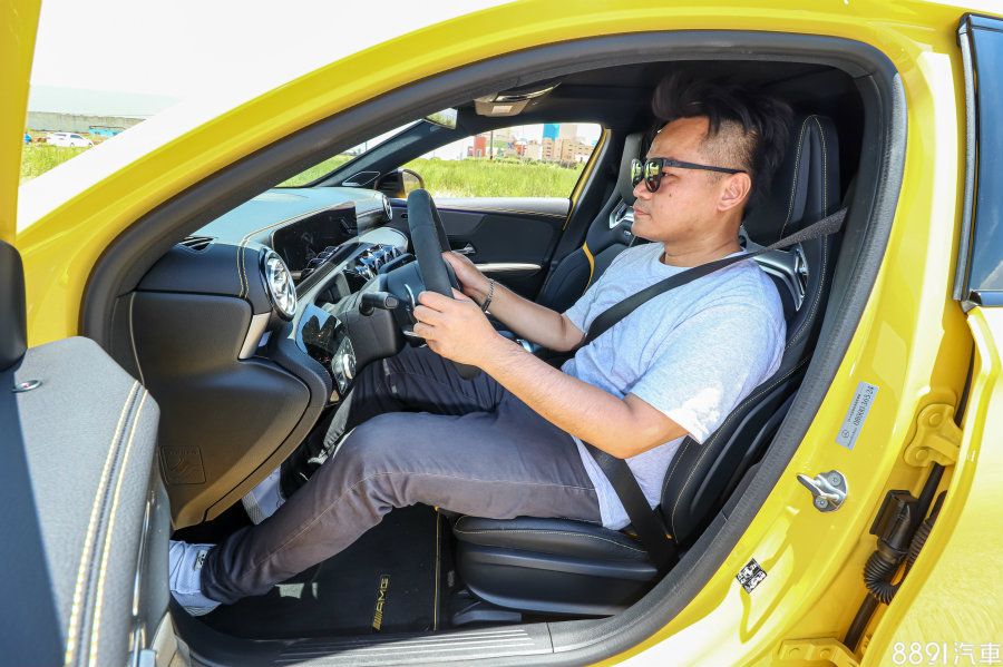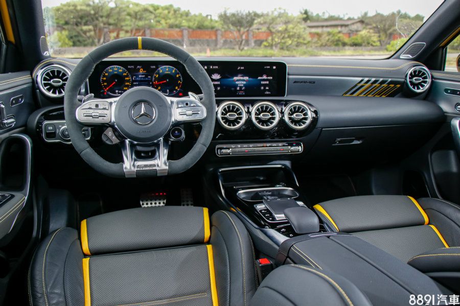 A 45 S標準內裝與A 35相當類似,像是雙10.25吋螢幕、MBUX多媒體系統、飾板、黑色頂蓬、64色氣氛燈等配置如出一轍,用料與質感均相當出色,不過試駕車有選配Edition 1套件,專屬的黃色AMG鋁質飾板搭配黃色縫線,讓車內的活潑感提升不少。