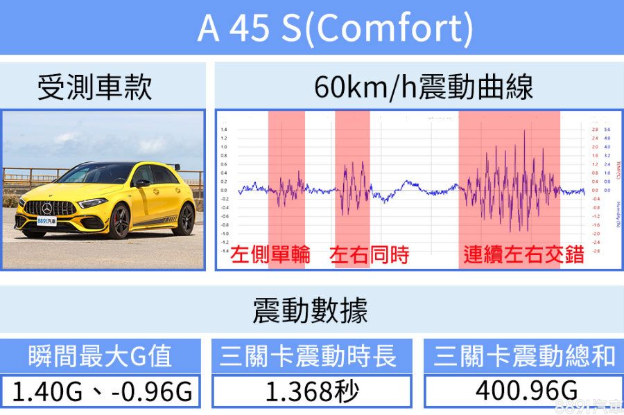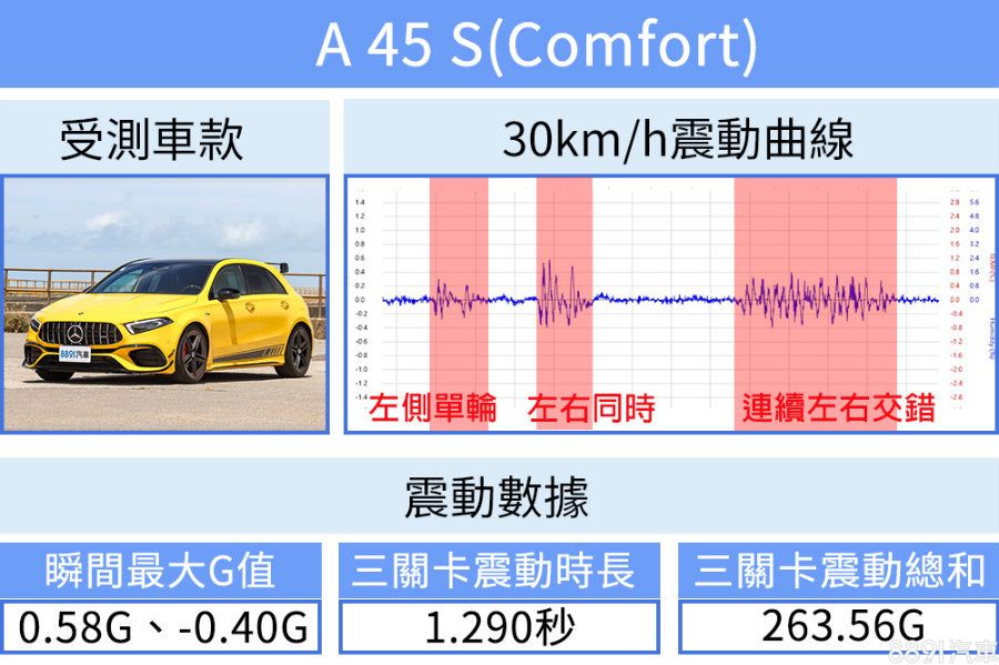 A 45 S在各模式下底盤性格分明,Sport Plus狀態下就像肌肉緊繃的運動員,下盤忠實傳遞路面回饋,相當戰鬥,以此狀態下進行震動測試,車身搖晃感比Comfort明顯,因此震動時長更久,G值總和也來到307.38G。