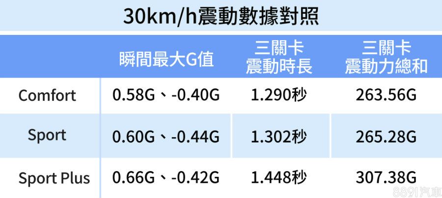 至於60km/h時懸吊模式差異,越往運動化模式調整,數值反而倒吃甘蔗,震動時長越來越短,G力總和也越來越小,顯見高速狀態下使用運動化模式,雖然瞬間衝擊感強,但車身回穩更加快速,對於一輛性能武車來說,確實是恰如其份的設定!