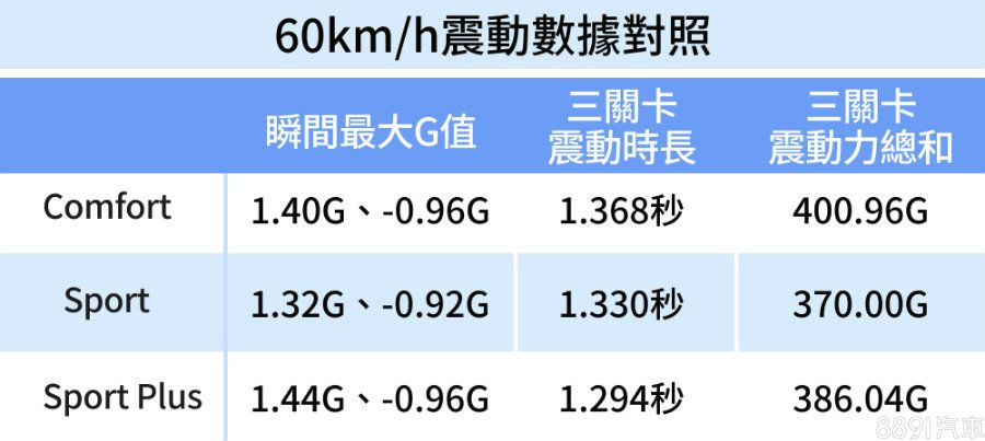 隨車速提高到60km/h,一樣以Comfort模式測試,通過陣仗時衝擊感比低速強烈,最大G值一舉來到1.40G、-0.96G,來到左右交錯陣型時,搖晃感受也較明顯,從圖形也可看出較不規律的波動,震動時長也是三模式中最長,不過整體來說還是比Sport Plus模式舒服。