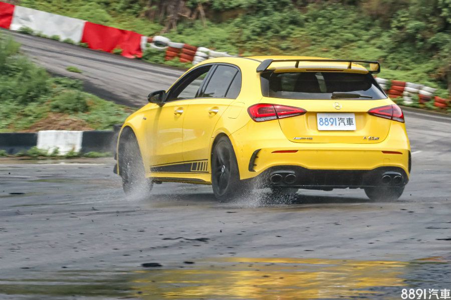 另外,A 45 S 4Matic+四驅系統有Drift Mode甩尾模式,讓後輪獲得較多的動力分配,不過實際分配給後輪的動力沒有想像的多,要做出畫面中的甩尾動作,在一般柏油乾地較為困難,需善用重心轉換、用拋的比較好達成,不然就是溼地或摩擦力降低的路面,便容易做出畫面中的大角度飄移。
