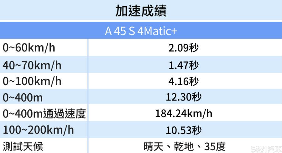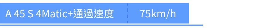 40~70km/h再加速考驗變速箱退檔反應,A 45 S 4Matic僅花了1.47秒,若檢視所有項目的表現,考量到炙熱天候與車輛里程仍低於1000km的條件,我們認為A 45 S 4Matic應該還有挑戰更佳成績的空間。