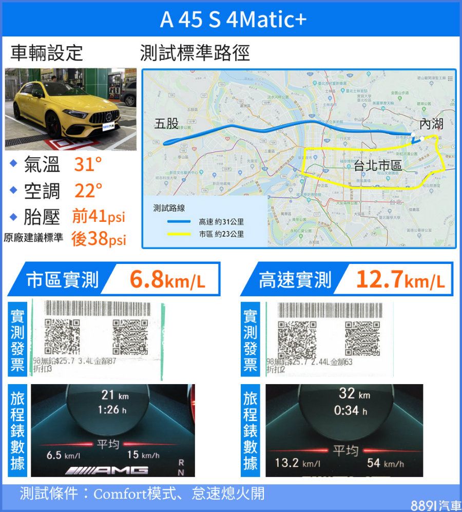 A 45 S 4Matic+沒有節能模式(Eco Mode),因此以預設的Comfort模式進行,並開啟怠速熄火功能,測試當天車流量多,高速路段也碰上時速不到40km/h的擁塞情況,12.7km/L的高速成績不算特別耗油,至於市區部分一樣都是走走停停,還好怠速熄火功能在每回停紅燈幾乎都能有效發揮,市區跑出6.8km/L很OK了!再考量此車以高性能訴求,看到實測的成果,相信潛在買家應該都能夠接受,