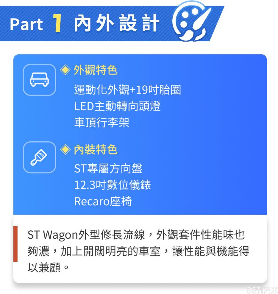 相較於掀背ST,ST Wagon也多了幾項專屬配備,如AFS高階LED轉向頭燈、車頂架、電動尾門等,讓實用性更高,但比較可惜的就是少了CCD電子懸吊,原廠表示Wagon車型為了因應載重,後懸吊幾何與掀背版不同,因此取消了電子阻尼,這點在全球車型都是相同配置。