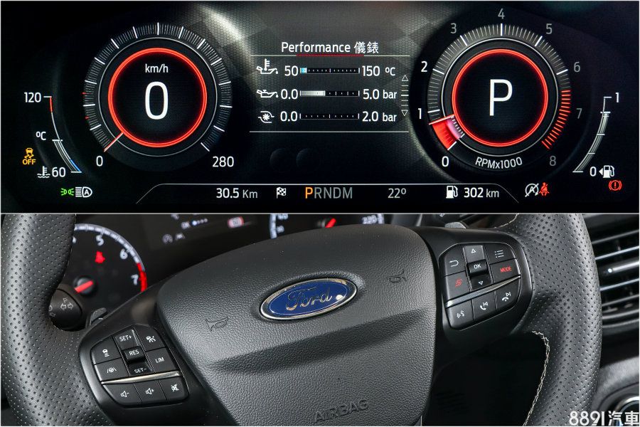 12.3吋數位儀錶頗具性能氣息,針對檔位與車速採大型化顯示,中央也提供水溫、機油壓力、增壓值等訊息,激烈操駕時更容易掌握車輛狀態。ST方向盤除了手感更好,右側控制鍵更增加駕駛模式選擇,雙手不用離開方向盤便能快速切換模式。