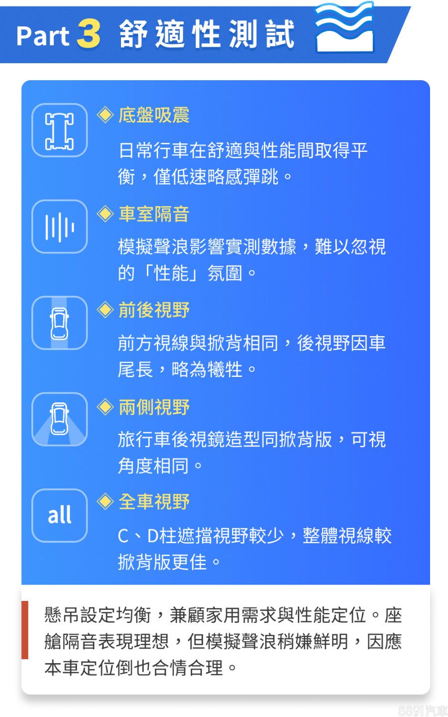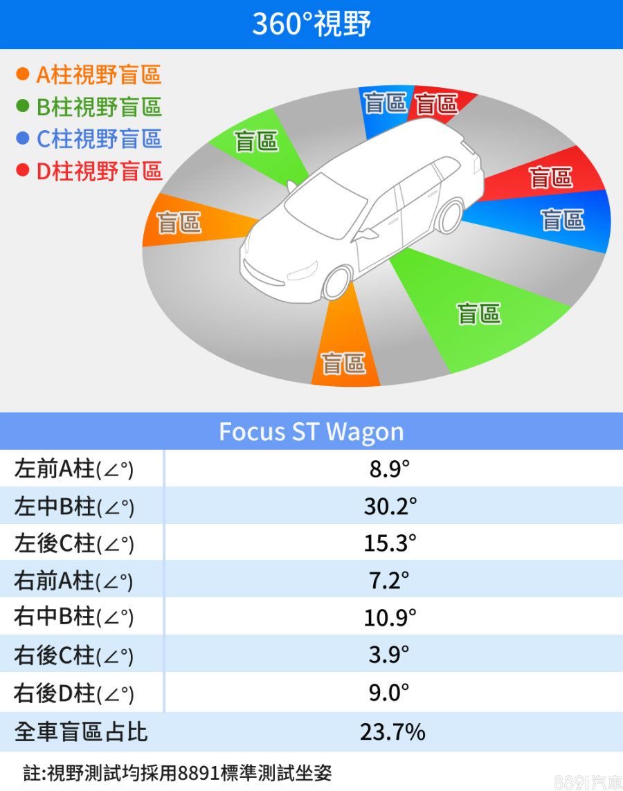 Wagon車身在前半截A、B柱位置視野表現與掀背車款相近,後方C、D柱位置則因為後方線條拉長、多了一片側窗,讓後方視野更為理想,往後轉頭較容易掌握後方死角,也讓整體盲區較掀背車款優異。