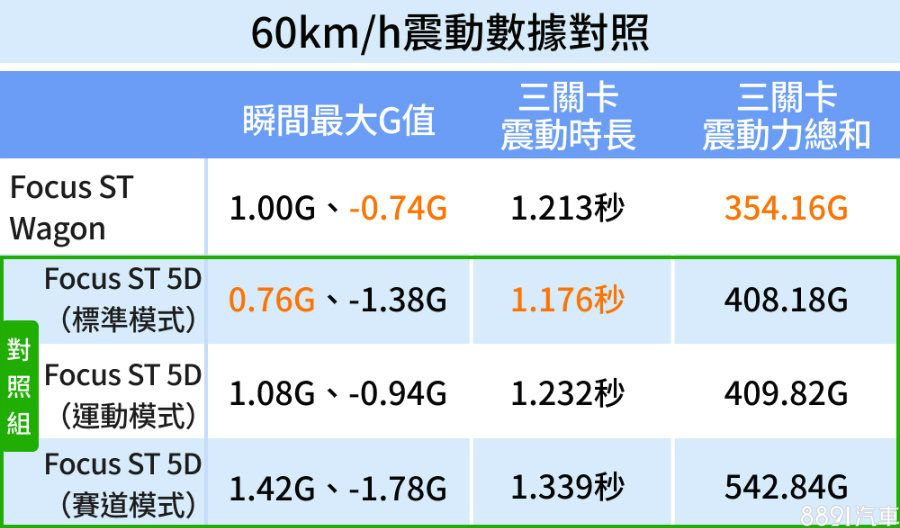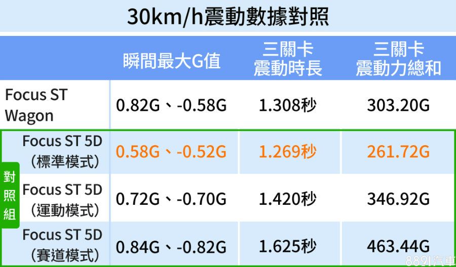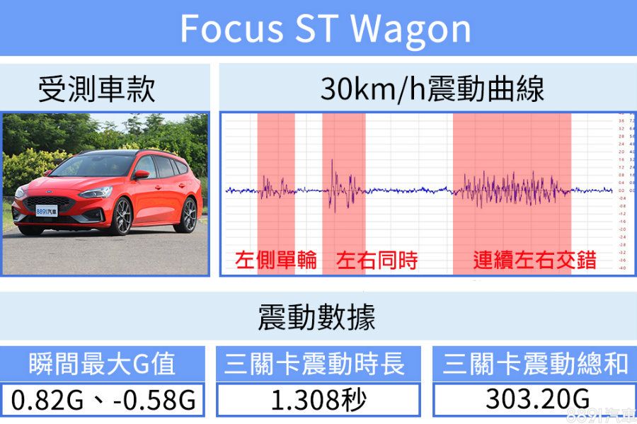 60km/h車速下,Focus ST Wagon瞬間最大G值僅小幅增加,震動時長則略為縮短,凸顯阻尼更能吸收高速所帶來的衝擊,震動總和也因此僅略微提高。對比30km/h測試,60km/h在體感上要更為平穩舒適。