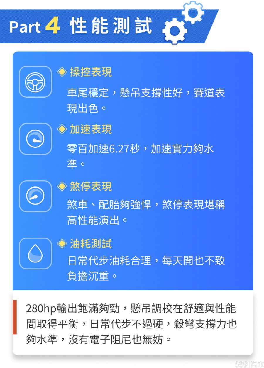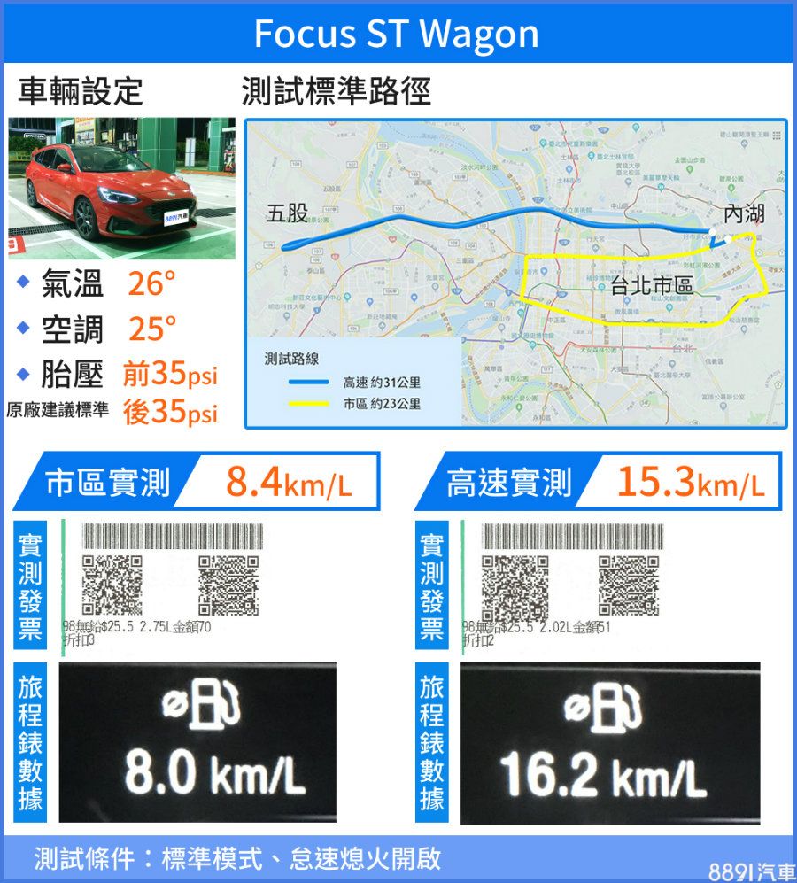 ST Wagon沒有節能模式,因此油耗測試採用標準模式進行,飽滿動力在市區行車實在舒服,尤其順暢路況之下幾乎只要輕點油門便能維持車速,要想超過慢速車也只要發揮「黃金腳尖」,無須拉轉更無須退檔,最終繳出8.4km/L實測成績;高速路況同樣順暢,出色扭力讓車速輕易維持在110km/h、跟隨車流遊走,最終測得15.3km/L高速油耗,以280hp性能車標準來看,油耗表現讓人滿意。