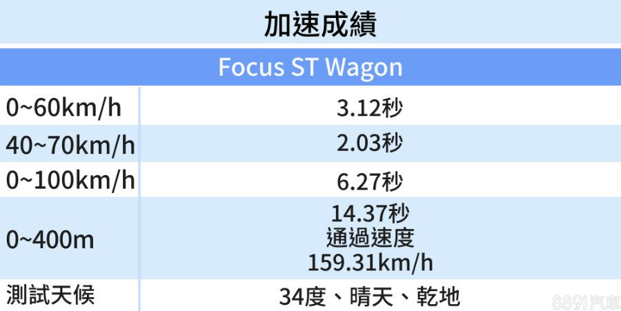 分析P-Box實測數據,Focus ST Wagon以6.27秒完成0~100km/h加速,對比掀背版的6.18秒歷史實測數據,差異微乎其微,也符合原廠所宣稱約0.1秒的加速差異。零四成績則為14.37秒,對照280hp輸出水準,表現相當不賴。