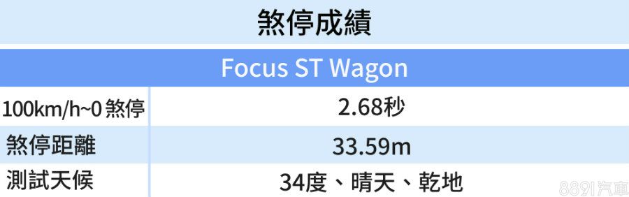 Focus不論ST-Line還是先前測試過的掀背版ST,煞停實測表現一向都很優異,這回ST Wagon也沒漏氣,100km/h~0僅用上短短33.59m便完全煞停,且車身穩定沒有任何晃動,車輛設定與配胎表現都功不可沒。不過ST Wagon煞車設定初段力道較強,激烈操駕雖能確實減速,日常行車卻得多加熟悉才能「停得舒服」。