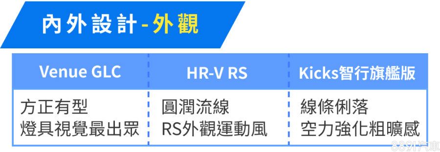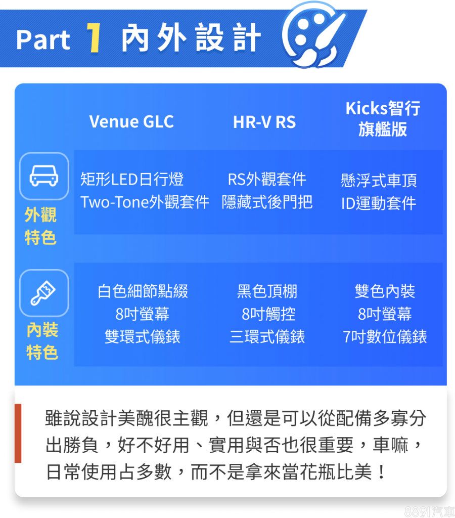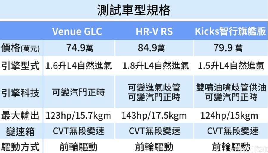 這次三車都是各自最高規的版本,條列在一起就能看出Venue有明顯的價格優勢, 動力部分,Venue和Kicks平起平坐,HR-V最貴,排氣量和數據也大了一截,但實際上能拉開多少差距也一樣實測分曉!