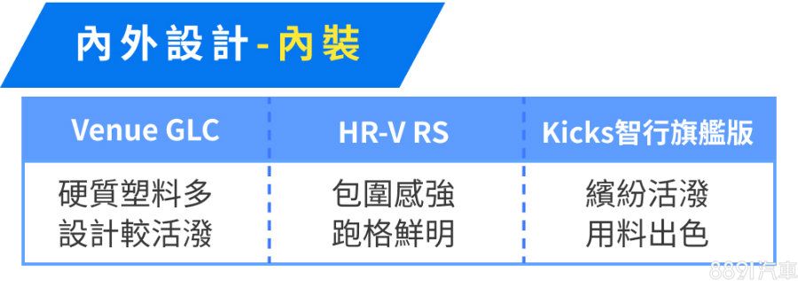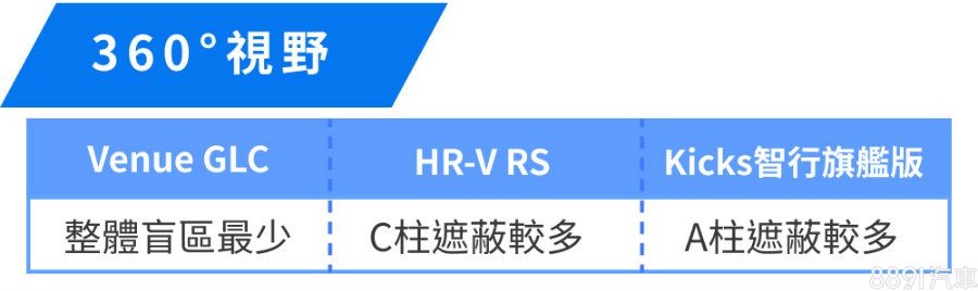 Venue的A柱、C柱死角三車最小,對於車身四周的掌握度也最好。HR-V與Kicks在這項目表現略遜一籌,但Kicks勝在配有環景影像,低速行車總是多一分保障。