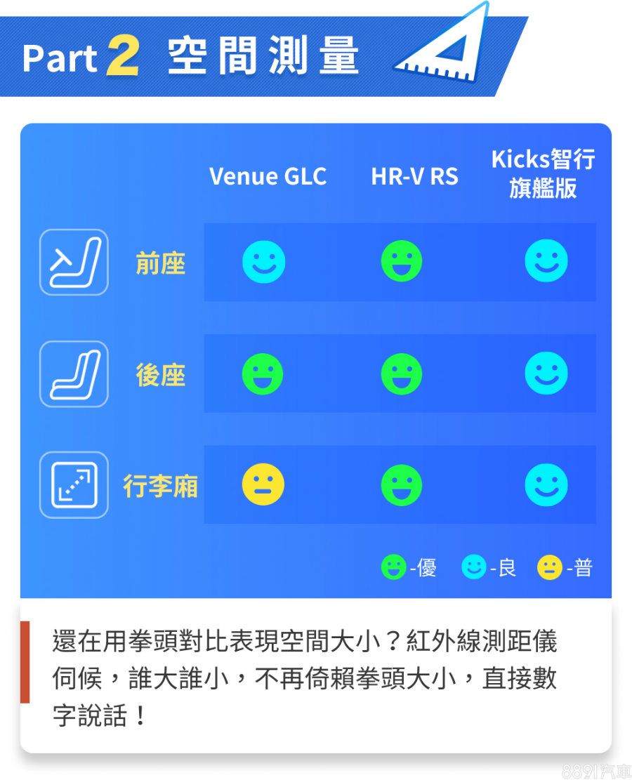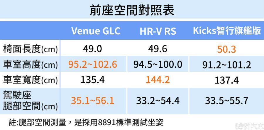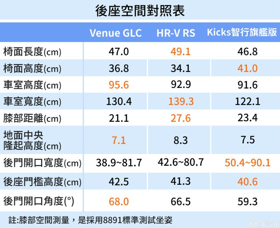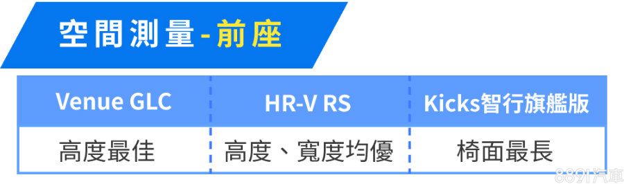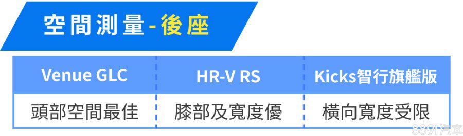 三車前座空間可用各有千秋來形容,Venue在頭部表現較為出色,乘坐感受確實比較開闊;HR-V則在車室寬度顯著優於對手,144.2cm的數據甚至比美部分中型SUV;Kicks則是在前座椅面長度勝出,雖然差異不大、但坐上前座就是因此更舒適一些。