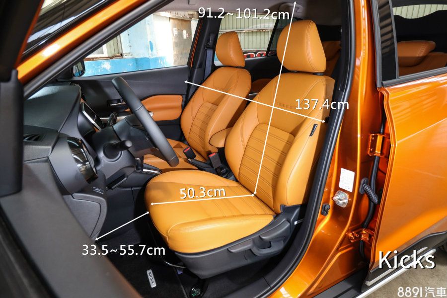 選配雙色車身便可同時選擇雙色內裝,儀錶台、座椅、門板等處都採用橘色皮質包覆,視覺感受活潑了不少,質感也比單調的黑色要更加提升。不同於Venue實用至上、HR-V的運動感,Kicks的內裝設計則偏重居家風格,沒有繁複線條、看來簡潔,但缺點就是置物機能相對貧乏,僅有排檔座前後設有小小的置物空間。